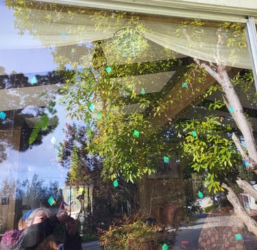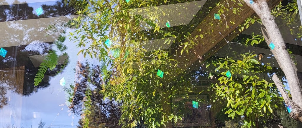 The crashes occurred at least once a week! If I kept the shades closed, it helped a little, but it still happened. If I let the windows get dirty it would help, but it still happened. I trimmed bushes away from the windows and removed the houseplants, and it still happened. I purchased the cute decals that were supposed to help, but it still happened because to work, I would have had to have wallpapered the windows with them. I studied about the problem and I started experimenting with different types of things that could be scattered all over the window. I didn’t like having my view diminished, and so when I finally created the perfect decals, the problem was solved. I can put them all over the window, 8 to 10 inches a part, and I barely notice the decals. The birds can now see the window as the decals color shift and flash, and I think they look pretty.
